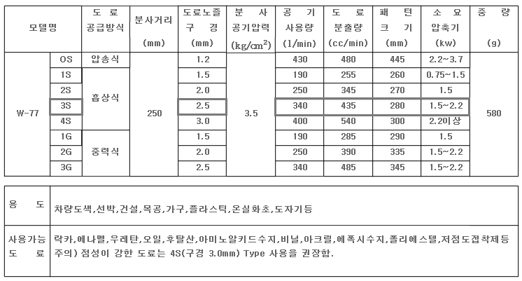 넓은면적도색용 (W-77-3S, 2.5mm) 에어용/흡상식 노즐규격:3S(2.5mm) 컵용량 : 1,000cc